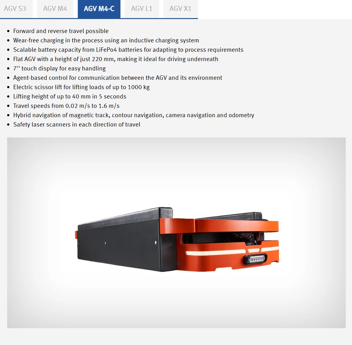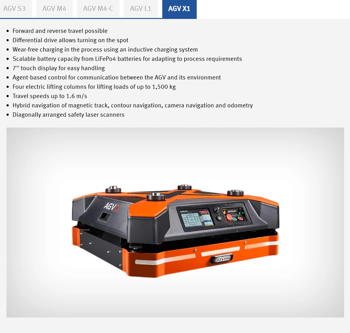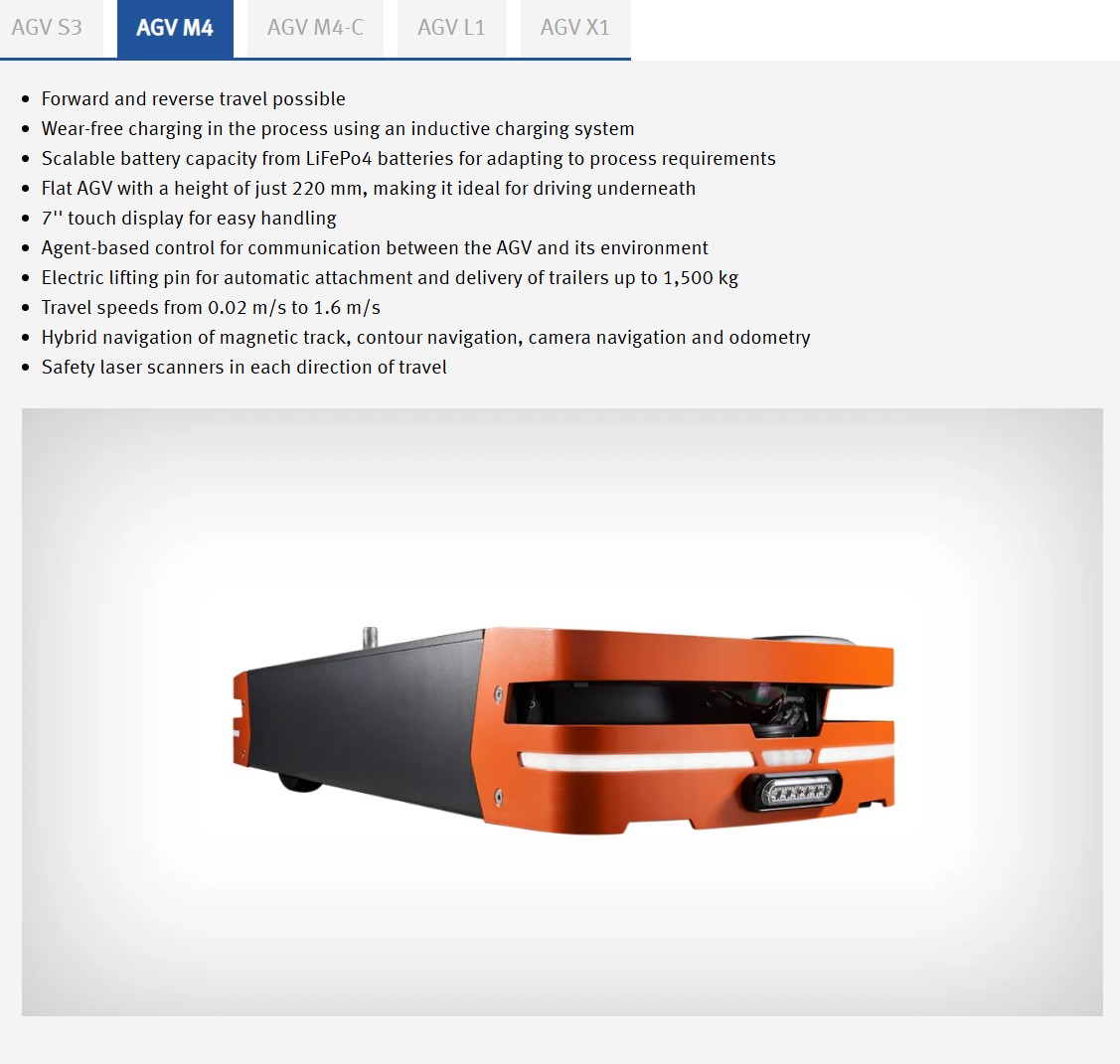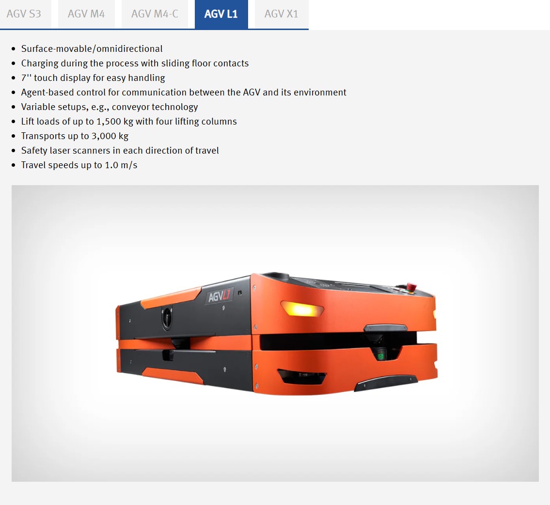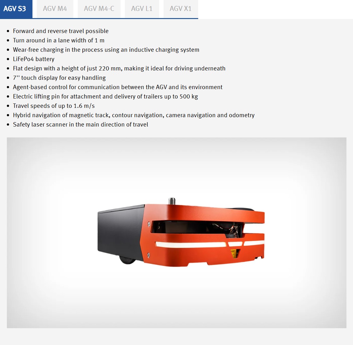 Det finns fem modeller att välja mellan, beroende på uppgift och driftsscenario. Alla enheter är lämpliga för antingen bogsering av vagnar och släpvagnar och/eller transport av topplaster. AGV-påbyggnader och kringsystem finns som tillval för kundspecifika processer.