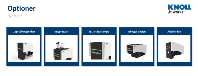 Basutrustningen för varje HydroPur-system omfattar ett hydrostatiskt HydroPur-filter och en renvätsketank, filterpapper eller ändlöst band, olika renpumpar, sensorer samt styrsystem. Den nya HydroPur kan även utrustas med vakuumstöd. På begäran kan KNOLL dessutom integrera en upprullningsenhet i systemet, som bland annat separerar smutsen/spånorna från det använda filterpappret och därmed bidrar till mer kostnadseffektiv avfallshantering. Andra tillval är magnetvals för förseparering, kåpa med LED-statuslampa, plattvärmeväxlare, duplexfilter, bandskimmer, kompressorkylare, styrskåp samt säkerhetsuppsamlingskärl. De flesta standardiserade funktionsmoduler kan även eftermonteras.