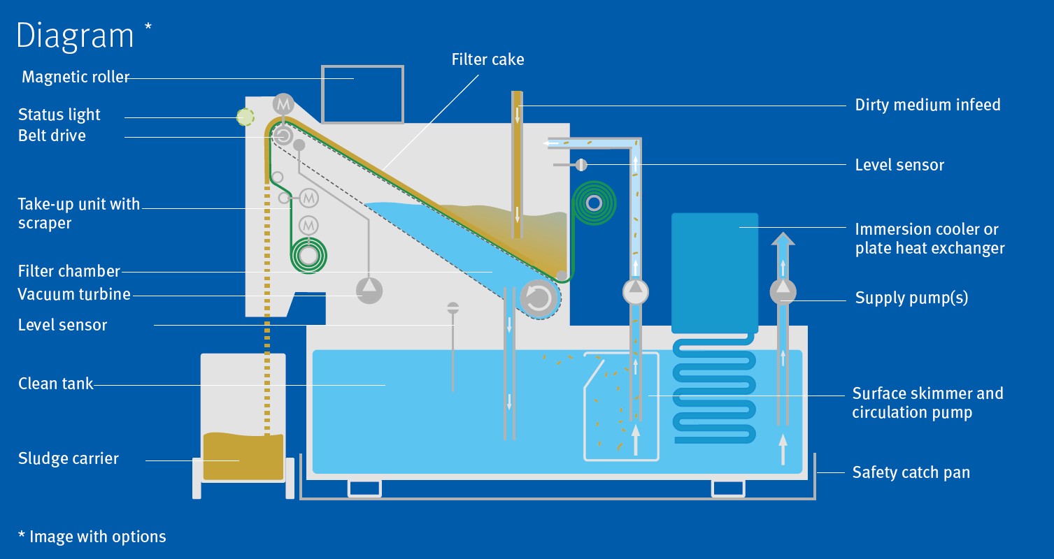 Särskilt anmärkningsvärt är vakuumstödet, som KNOLL tidigare endast erbjöd tillsammans med HL-filtret. Vakuumet ökar genomströmningen av skärvätskan och gör att en homogen filterkaka byggs upp snabbare, vilket även avlägsnar de allra finaste partiklarna. Användaren får renare skärvätska, vilket bland annat har en positiv inverkan på bearbetningens kvalitet och verktygens livslängd. En torksektion säkerställer att slammet matas ut i torrare form än exempelvis vid plana bäddfilter. Detta minskar både avfallskostnader och förlust av skärvätska.