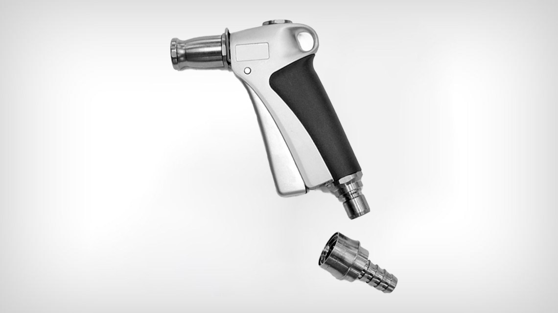Spolpistol i smidig och robust konstruktion som tål skärvätska och olja. Med snabbkoppling och ögla för enkel upphängning.